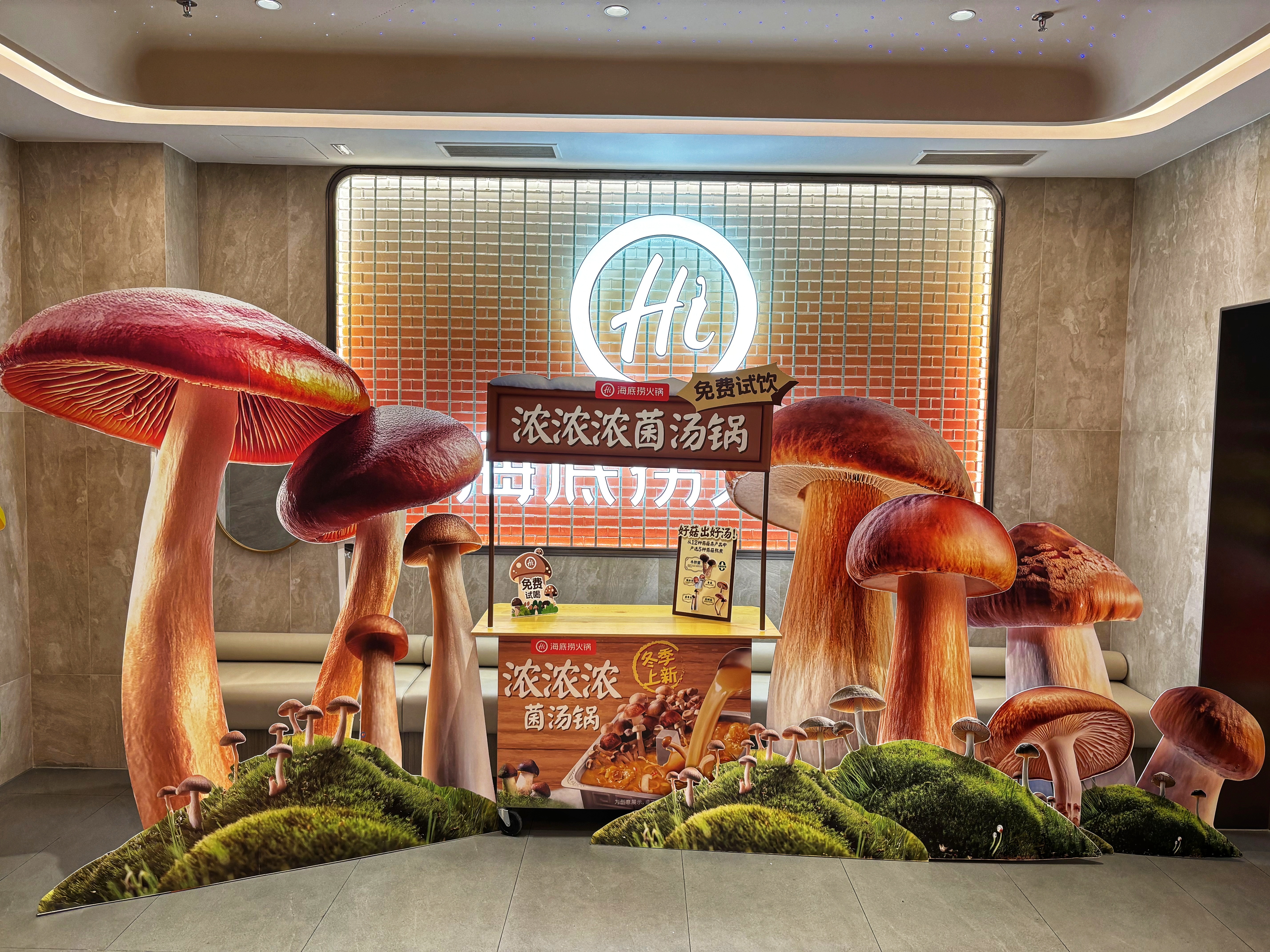 海底捞门店为理睬冬季上新,寰球超千家门店设立外摆回味车,邀请战役门客一齐品味菌汤,往日所未有的“千店菌汤尝鲜”举止,掀翻了一波感觉、视觉、味蕾的多重感官盛宴。让不少门客皆从这一口浓汤吃到了冬天第一顿暖锅,有些浮滥者直言,“香朦胧了,在几十米外闻着香味就来了!”。