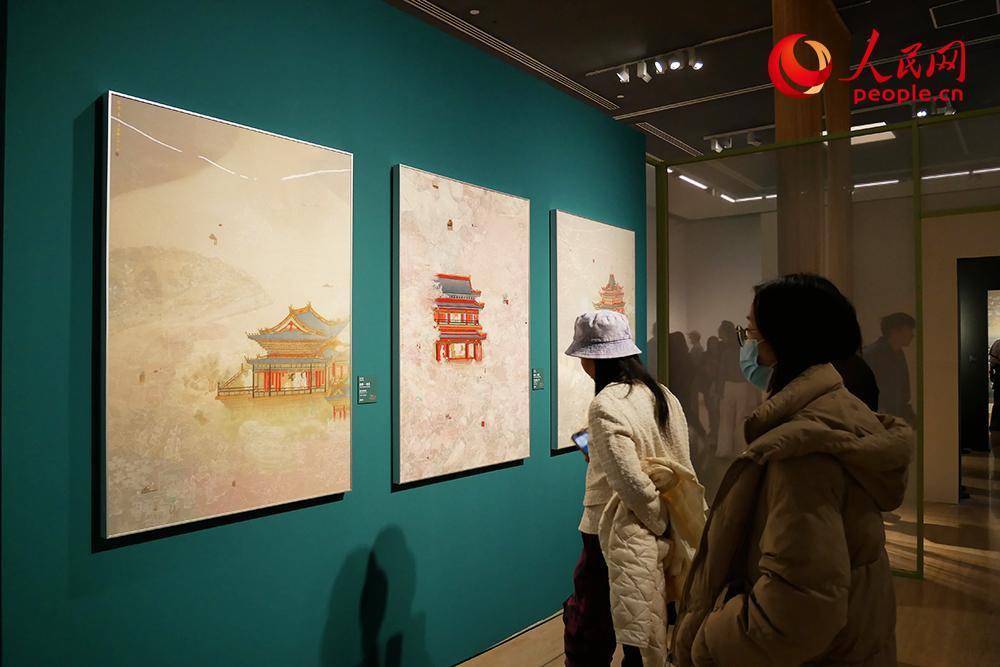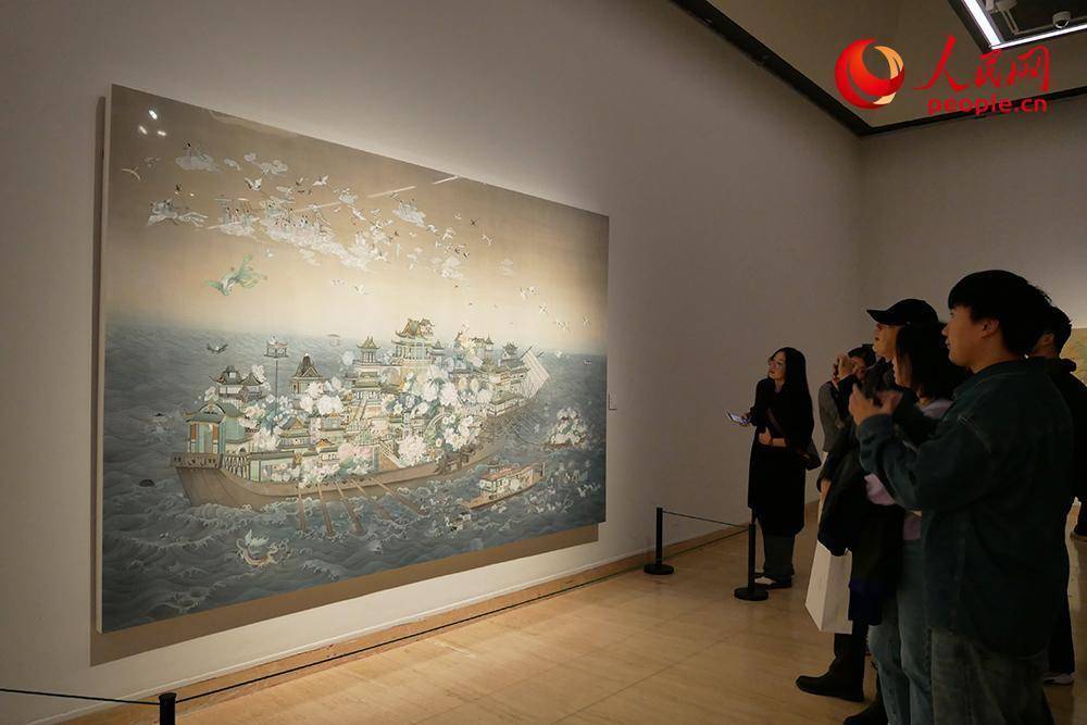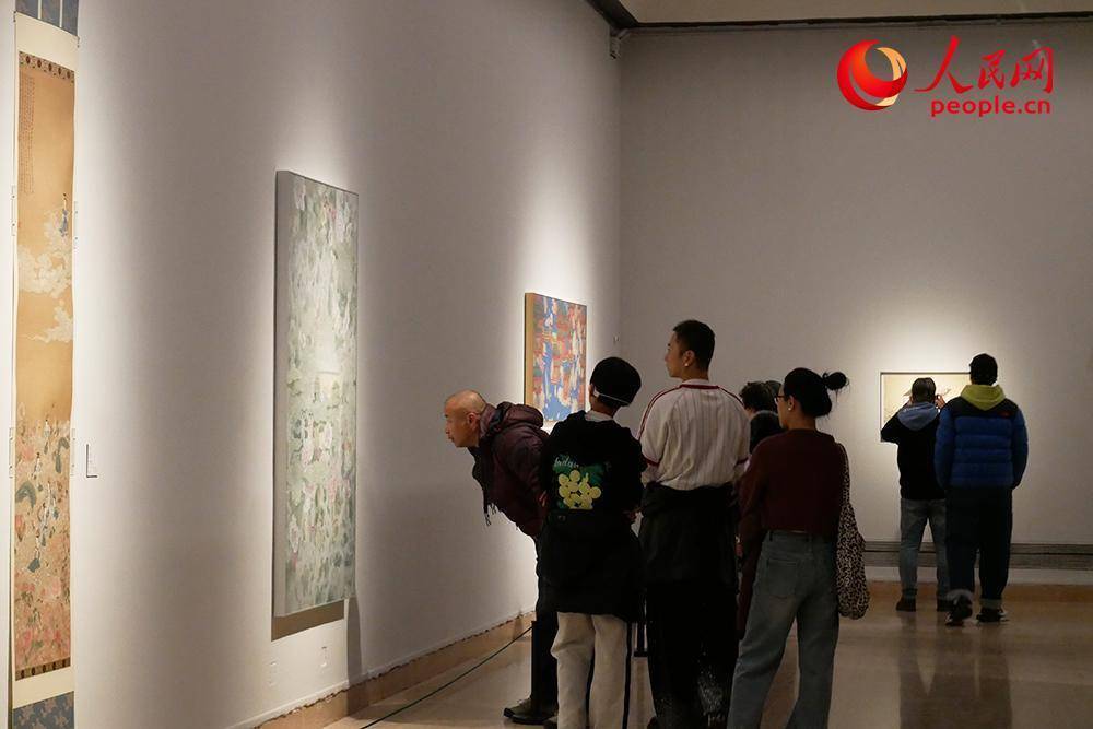 不雅众正在参不雅展览。东谈主民网记者 韦衍行摄东谈主民网北京11月24日电 (记者韦衍行)11月23日,“灼灼其华——王依雅作品展”在中国好意思术馆开幕,展览呈现艺术家王依雅新近创作的“水上可安堵”“繁空录”“痴园”“女诫”系列等绘画和安装作品20余件。