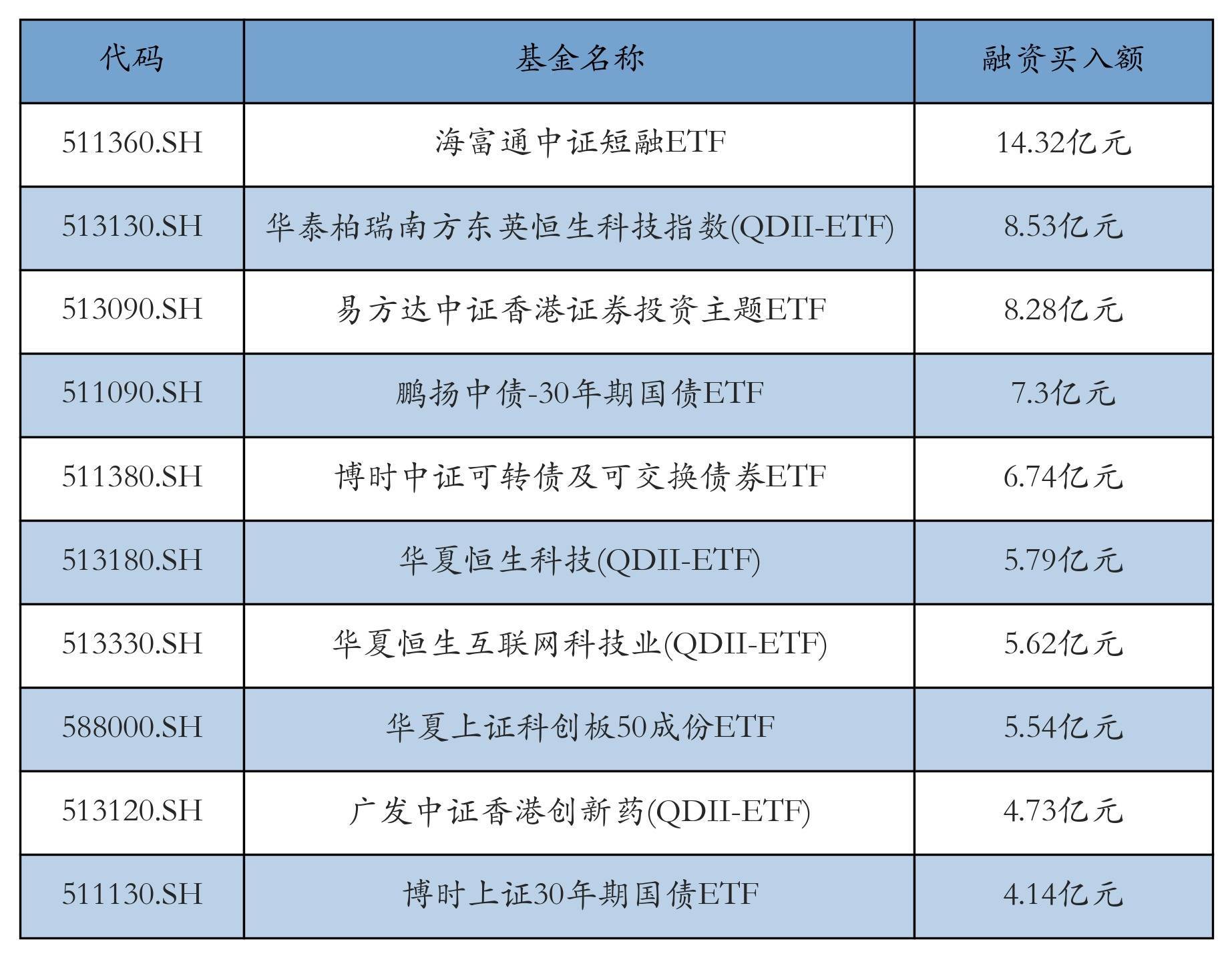 12月4日ETF融资买入额前三位差异为:海富通中证短融ETF(14.32亿元)、华泰柏瑞南边东英恒生科技指数(QDII-ETF)(8.53亿元)和易方达中证香港证券投资主题ETF(8.28亿元),前10具体见下表: