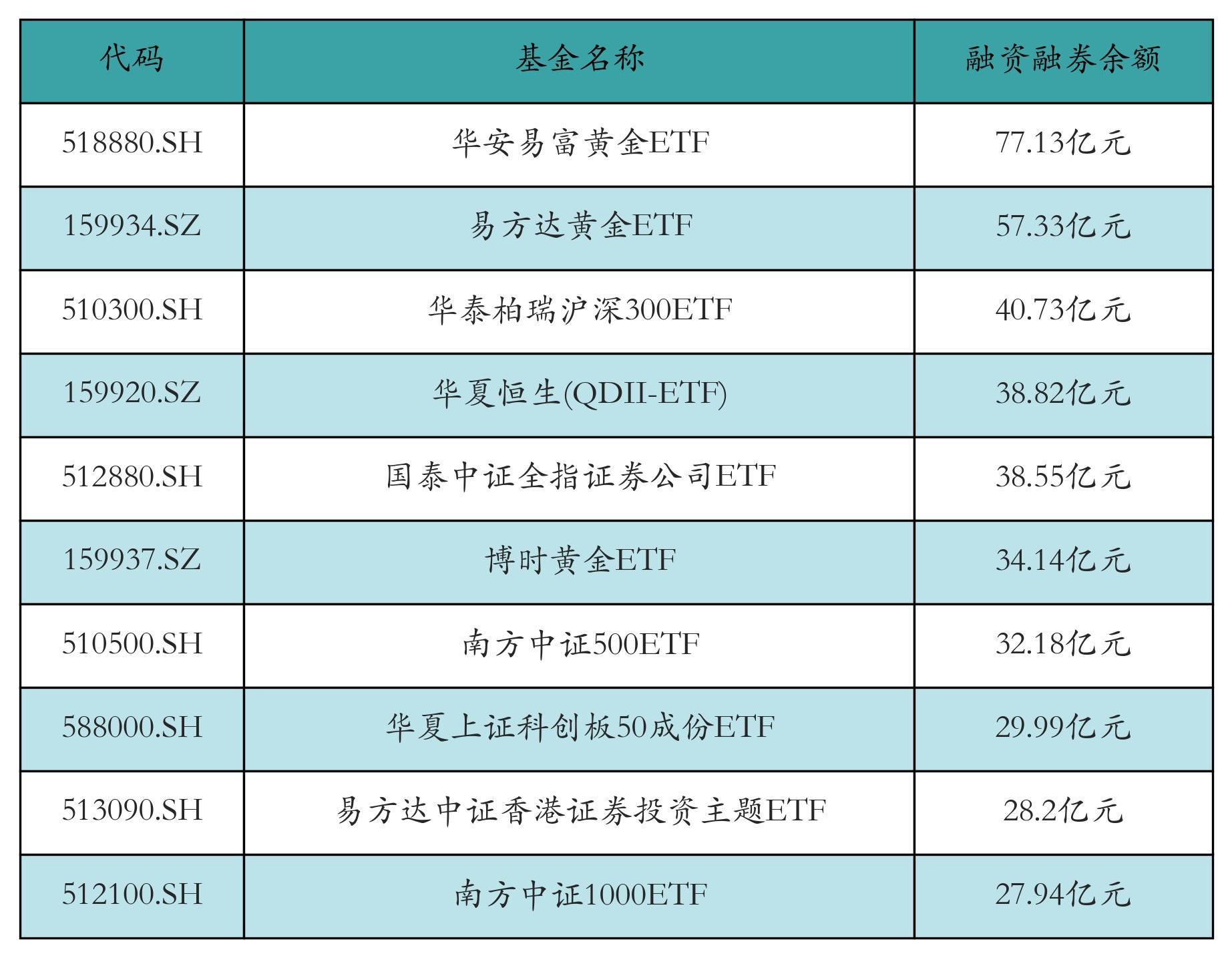 12月4日ETF两融余额前三位差异为:华安易富黄金ETF(77.13亿元)、易方达黄金ETF(57.33亿元)和华泰柏瑞沪深300ETF(40.73亿元),前10具体见下表: